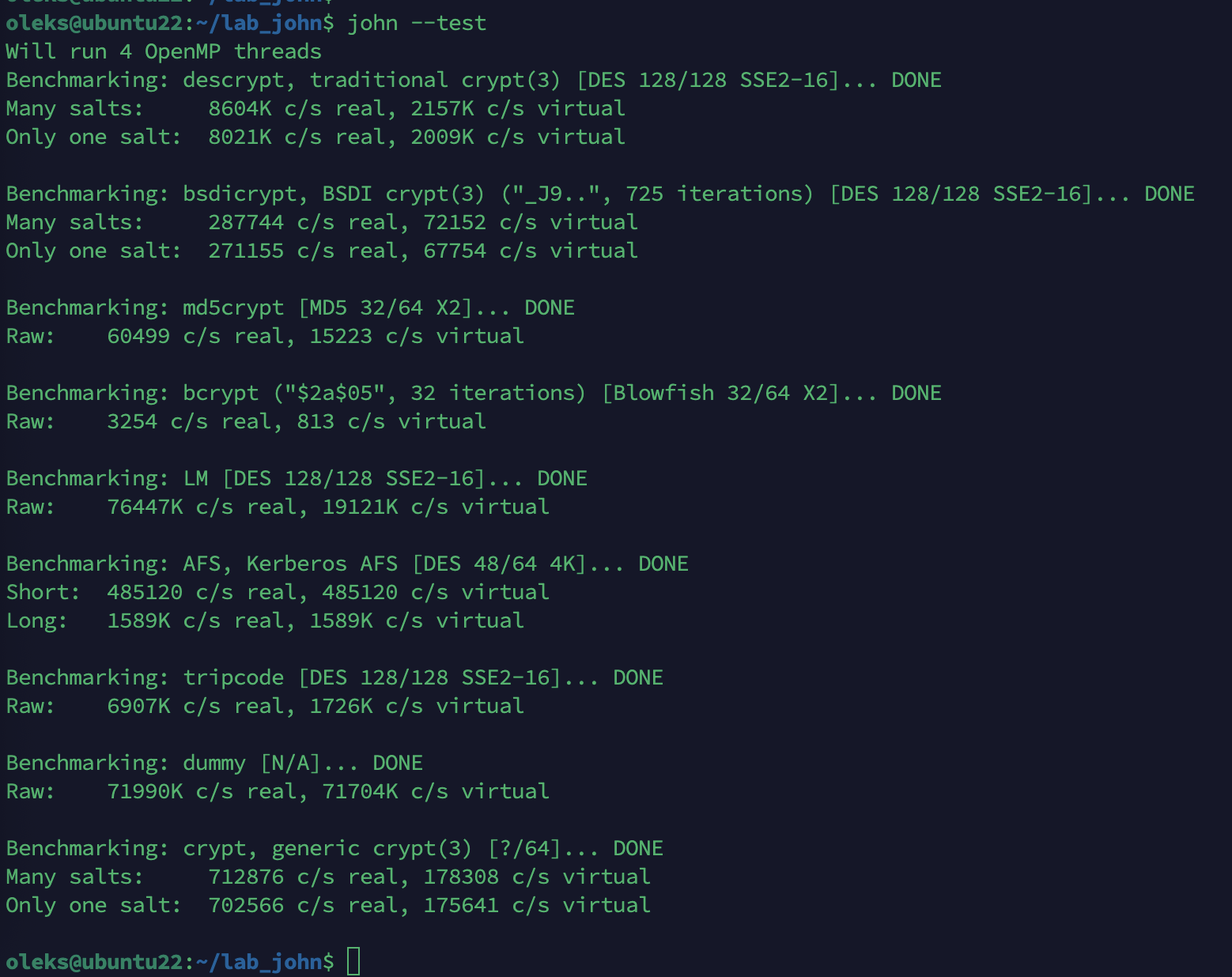 Prérequis : pour le test, j’ai utilisé Ubuntu 22.04 sur Proxmox (4 vCPU, 8 Go de RAM). Je travaillerai avec l’utilisateur oleks, qui fait partie du groupe sudo. Après le test, si la VM n’est pas dédiée uniquement à ces essais comme dans mon cas, supprimez ou effacez de façon sécurisée le fichier monpass.l, car il contient des hachages de mots de passe.