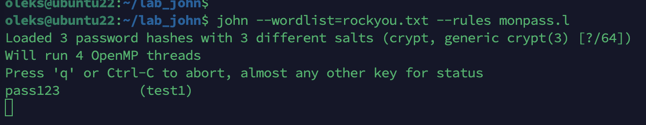 unshadow rassemble les noms d’utilisateurs de /etc/passwd et les mots de passe hachés correspondants de /etc/shadow au format user:hash:… lisible par John the Ripper. La commande doit être exécutée avec sudo, car /etc/shadow n’est lisible que par root. Le fichier monpass.l contient des hachages de mots de passe — gardez-le en sécurité (restreignez les droits) et supprimez-le dès la fin du laboratoire si la VM n’est pas isolée.