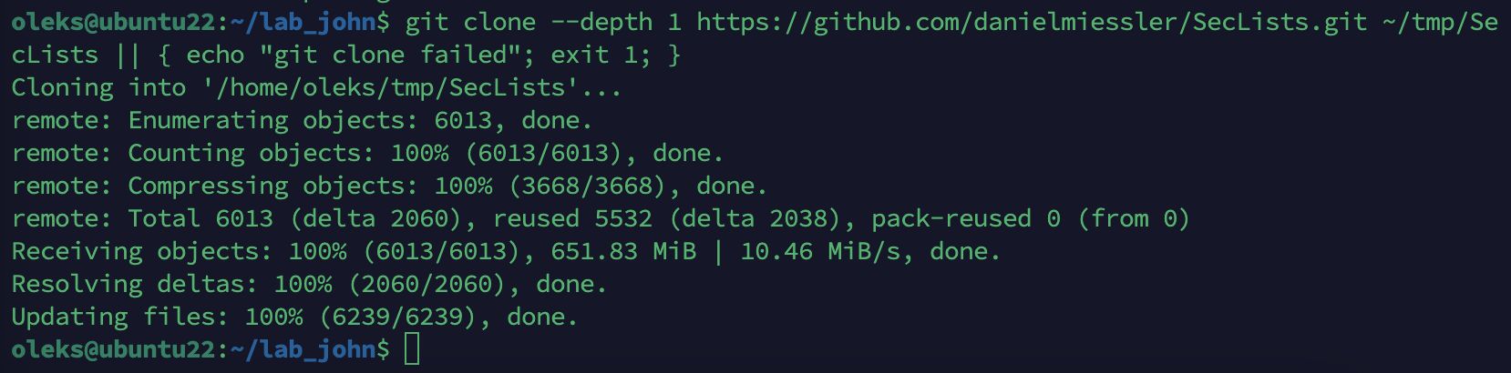 git clone --depth 1 https://github.com/danielmiessler/SecLists.git ~/tmp/SecLists || { echo "git clone failed"; exit 1; }