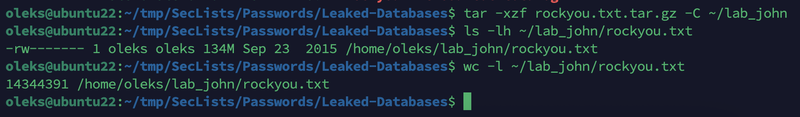 tar -xzf rockyou.txt.tar.gz -C ~/lab_john # ou pour être précis : tar -xzf ~/tmp/SecLists/Passwords/Leaked-Databases/rockyou.txt.tar.gz -C ~/lab_john