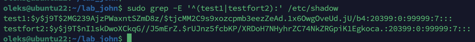 sudo grep -E '^(test1|testfort2):' /etc/shadow