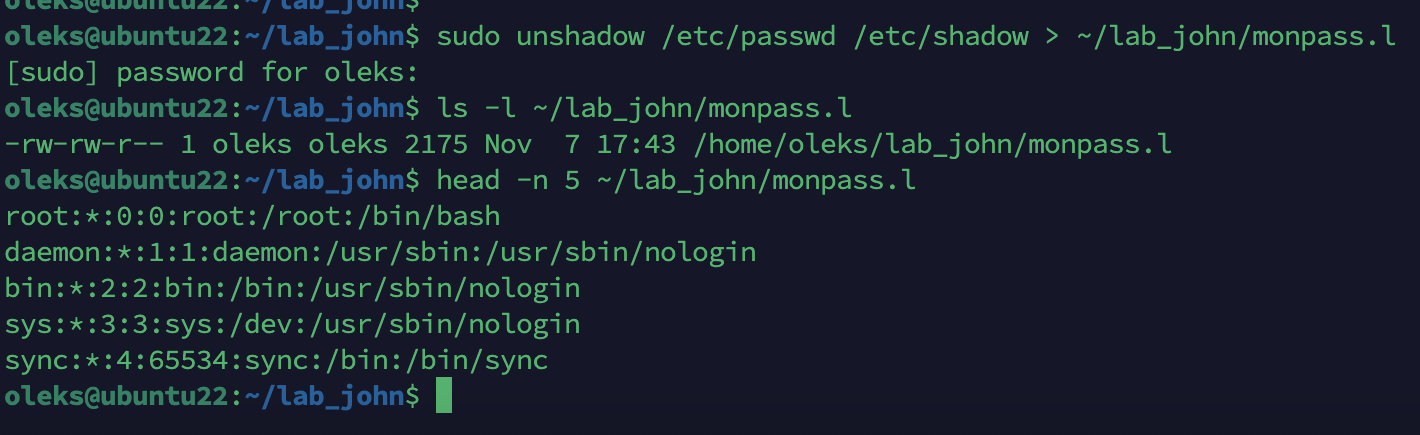 sudo unshadow /etc/passwd /etc/shadow > ~/lab_john/monpass.l ls -l ~/lab_john/monpass.l head -n 5 ~/lab_john/monpass.l