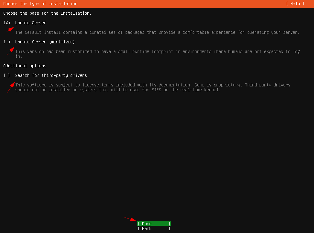 Dans cette étape, vous choisissez le type d’installation d’Ubuntu. Par défaut, Ubuntu Server est sélectionné, mais ici, l’option Ubuntu Server (minimized) a été choisie. Cette version allégée est conçue pour des environnements où les connexions fréquentes ne sont pas nécessaires. L’option Search for third-party drivers est activée afin de détecter et installer les pilotes propriétaires requis. Une fois votre sélection faite, choisissez Done pour continuer.