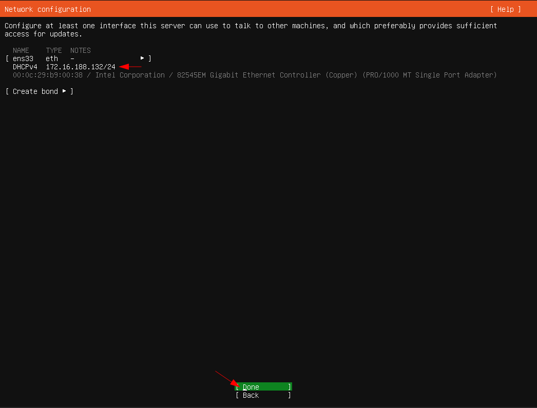 Dans l’étape de configuration réseau, il est possible d’utiliser l’adresse IP attribuée automatiquement par le serveur DHCP (dans ce cas, 172.16.188.132). Cependant, pour un serveur, il est recommandé de configurer une adresse IP statique afin d’assurer une connectivité stable. Vous pouvez laisser l’adresse en mode DHCP pendant l’installation et configurer l’adresse statique manuellement après l’installation. Mais vous pouvez aussi configurer L’adresse ip statique maintenant, j’ai expliqué ce procédé dans Installation ubuntu 24.04 sur Proxmox.