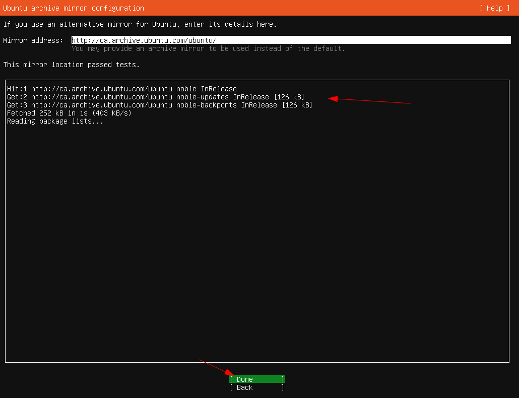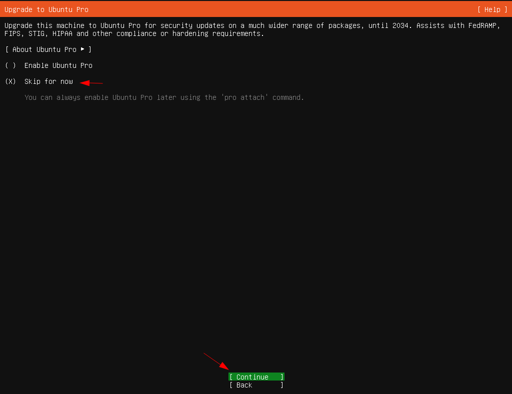 Dans cette étape, vous pouvez activer Ubuntu Pro pour bénéficier de mises à jour de sécurité étendues jusqu’en 2034, ce qui est idéal pour les environnements nécessitant une conformité stricte (FedRAMP, FIPS, etc.). Ubuntu Pro est un service payant. Dans cet exemple, j’ai choisi Skip for now. Choisissez Done pour valider et passer à l’étape suivante.