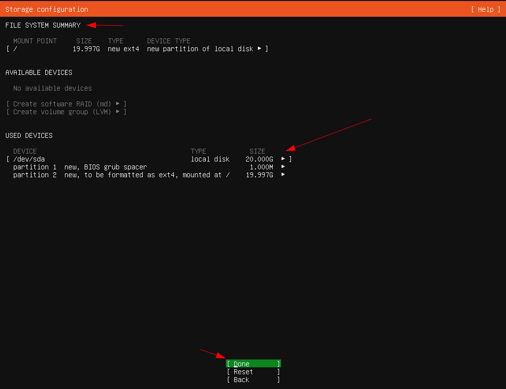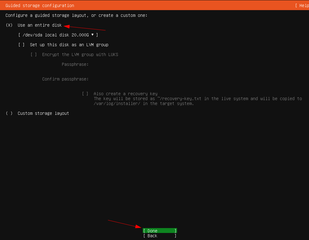 Dans cet exemple, je n’utilise pas LVM. Une fois votre choix effectué, Choisissez Done pour continuer l’installation.
