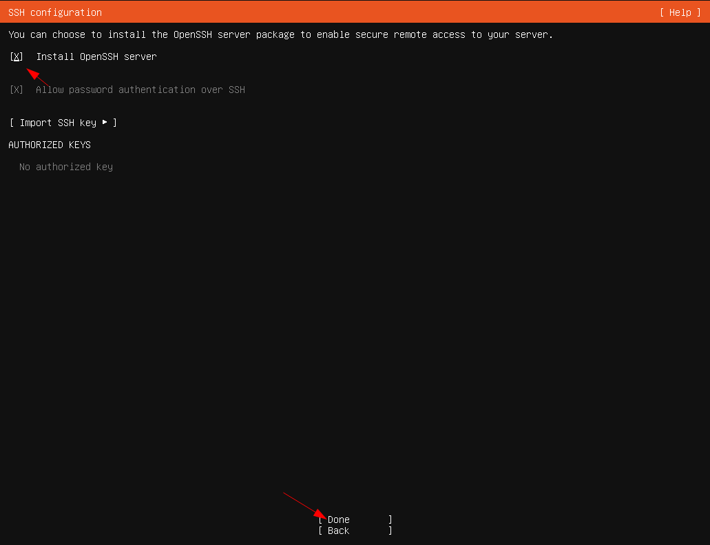 J’ai choisi Install OpenSSH server afin de permettre la connexion au serveur via SSH. Choisissez Done pour valider et passer à l’étape suivante.