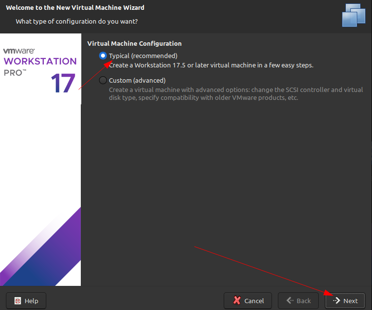 Choisissez l’option Typical (recommandée) pour une configuration rapide et facile de votre machine virtuelle. Cliquez ensuite sur Next pour continuer.