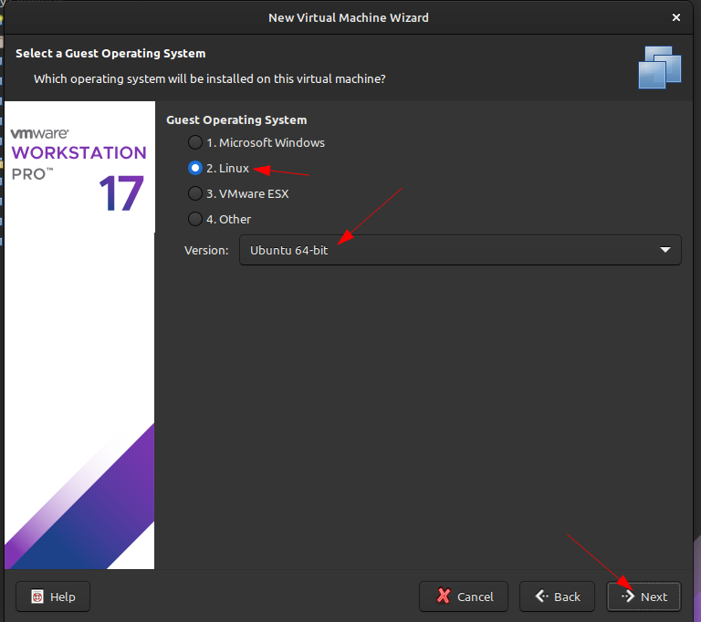 Choisissez Linux et Ubuntu 64 bit. Cliquez sur Next pour continuer.