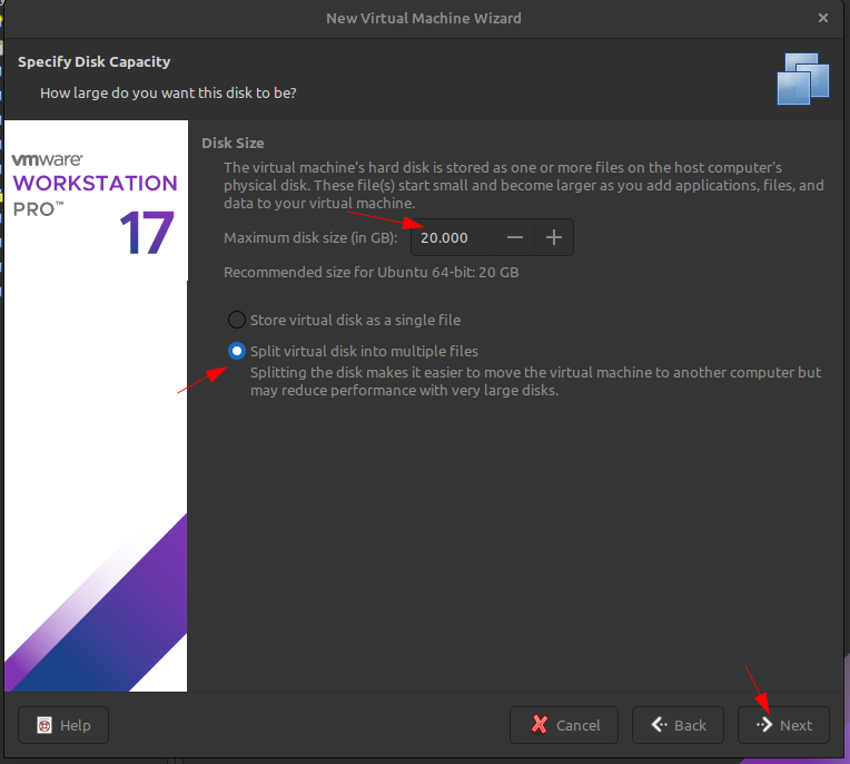 - Split virtual disk into multiple files (divisez le disque virtuel en plusieurs fichiers) : J’ai choisi cette option car elle facilite le déplacement de la machine virtuelle et réduit le risque de fragmentation. Cela peut aussi être utile si vous avez des limitations de taille de fichier sur le système de fichiers de votre disque hôte.