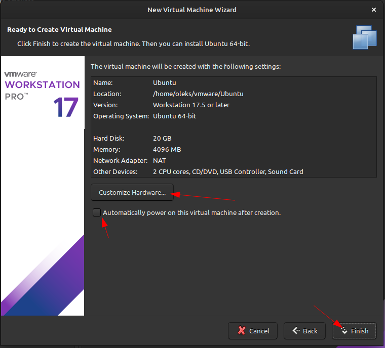 Avant de continuer, vous pouvez aussi cocher l’option Power on this virtual machine after creation pour démarrer la machine virtuelle automatiquement après sa création.