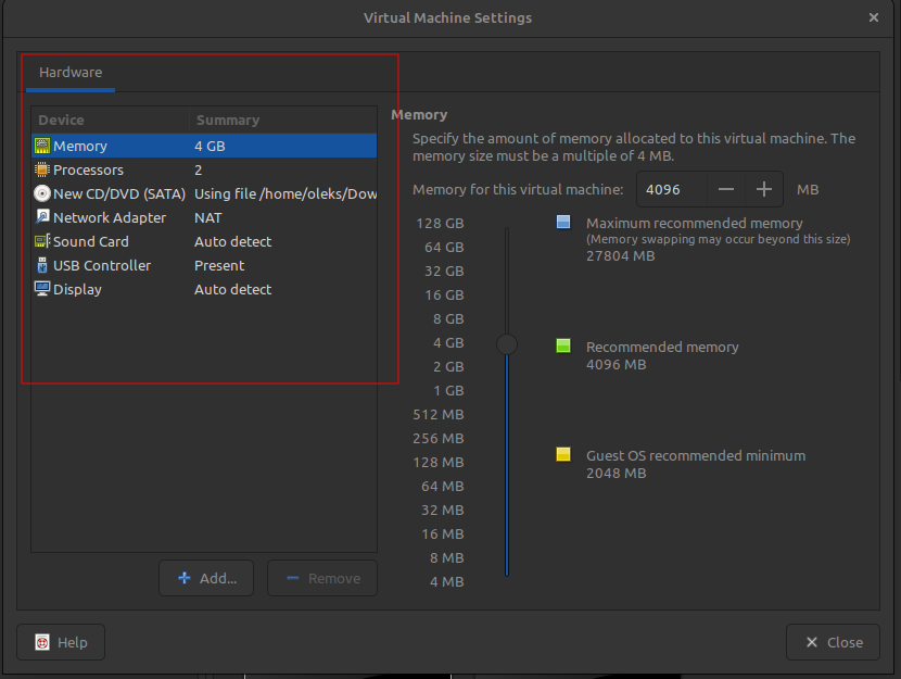 Dans le menu Customize Hardware, vous pouvez ajuster les ressources allouées à la machine virtuelle :