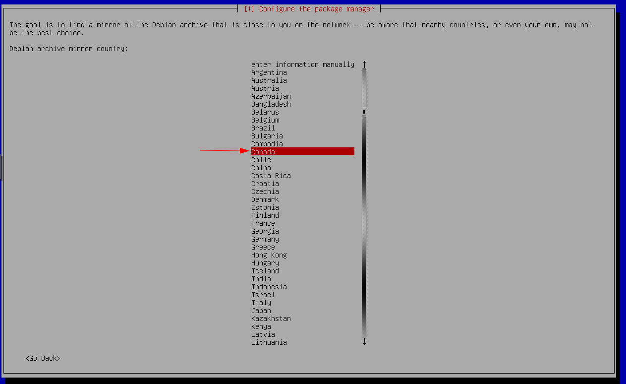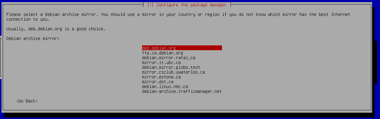 Choisissez deb.debian.org, puis appuyez sur Entrée.