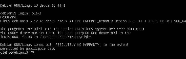 Après l’installation de Debian 13, j’ai pu me connecter à la machine à distance via SSH, en utilisant le nom d’utilisateur et le mot de passe que j’avais définis pendant l’installation.