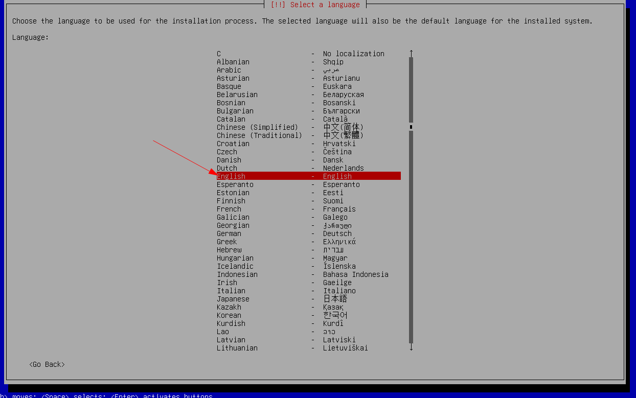 La première étape de l’installation en mode texte consiste à choisir la langue du système.