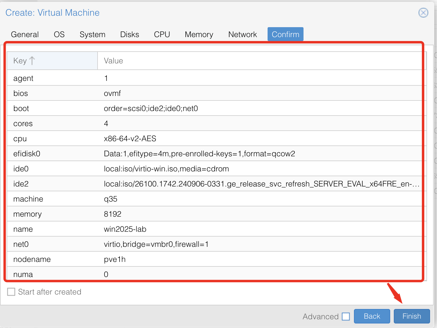 Si vous souhaitez démarrer l’installation immédiatement, cochez la case Start after created. Sinon, vous pouvez ajouter des composants (ex. : deuxième disque dur, carte réseau) avant de commencer l’installation