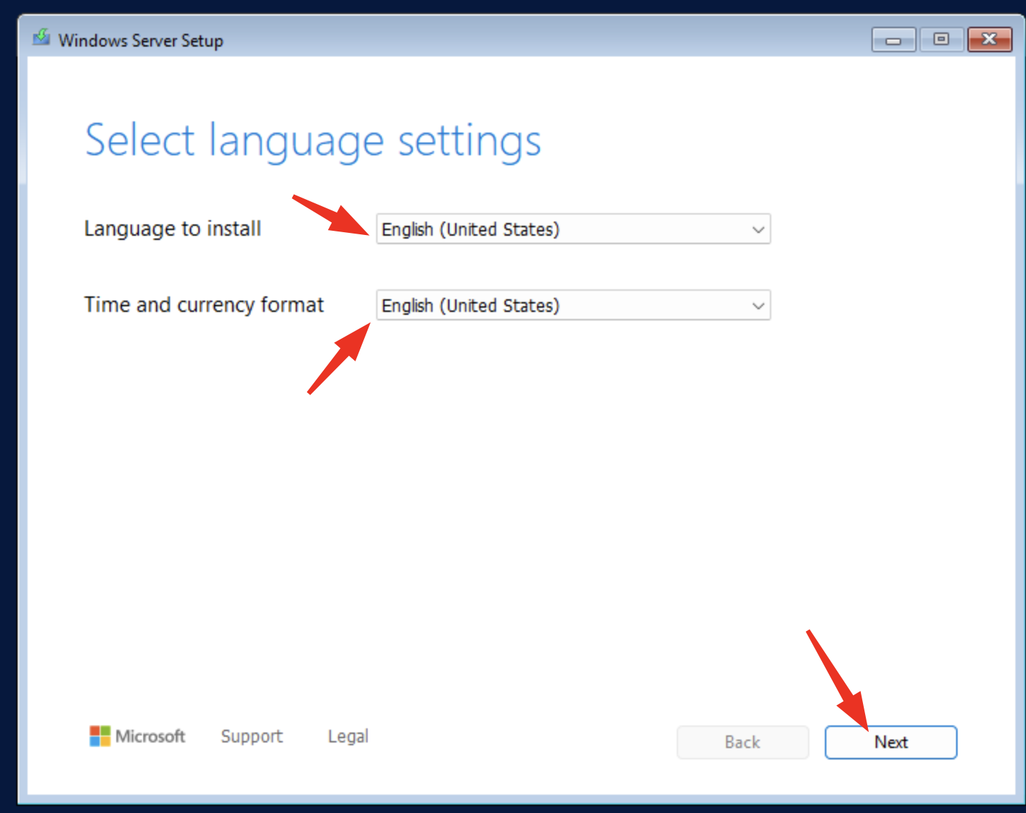 Sélectionnez la langue d’installation ainsi que le format régional, puis cliquez sur Next.