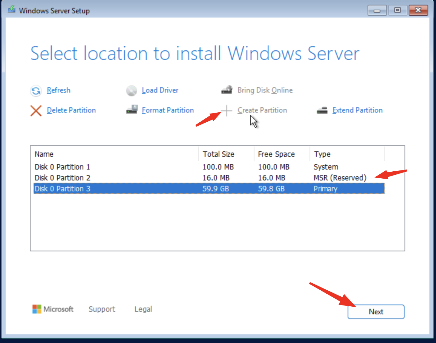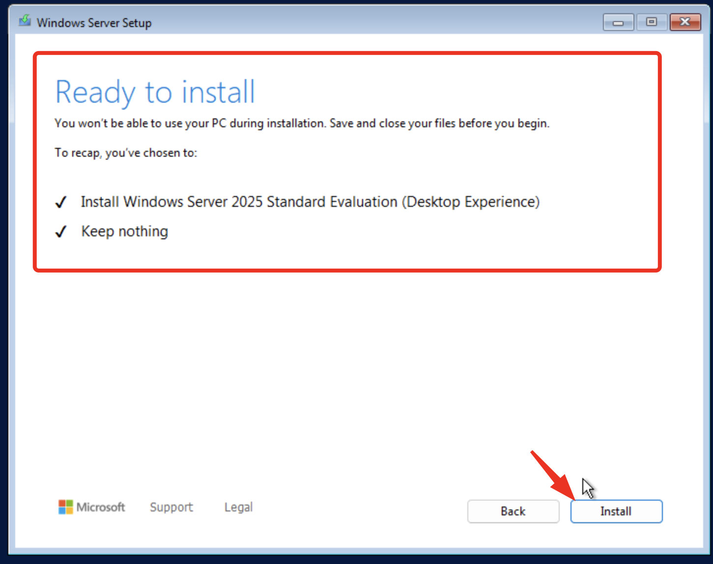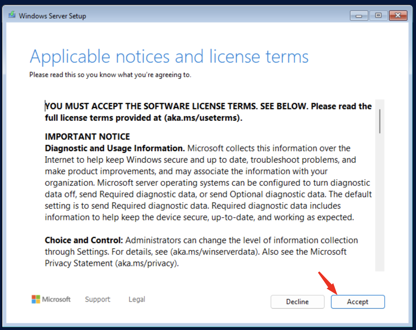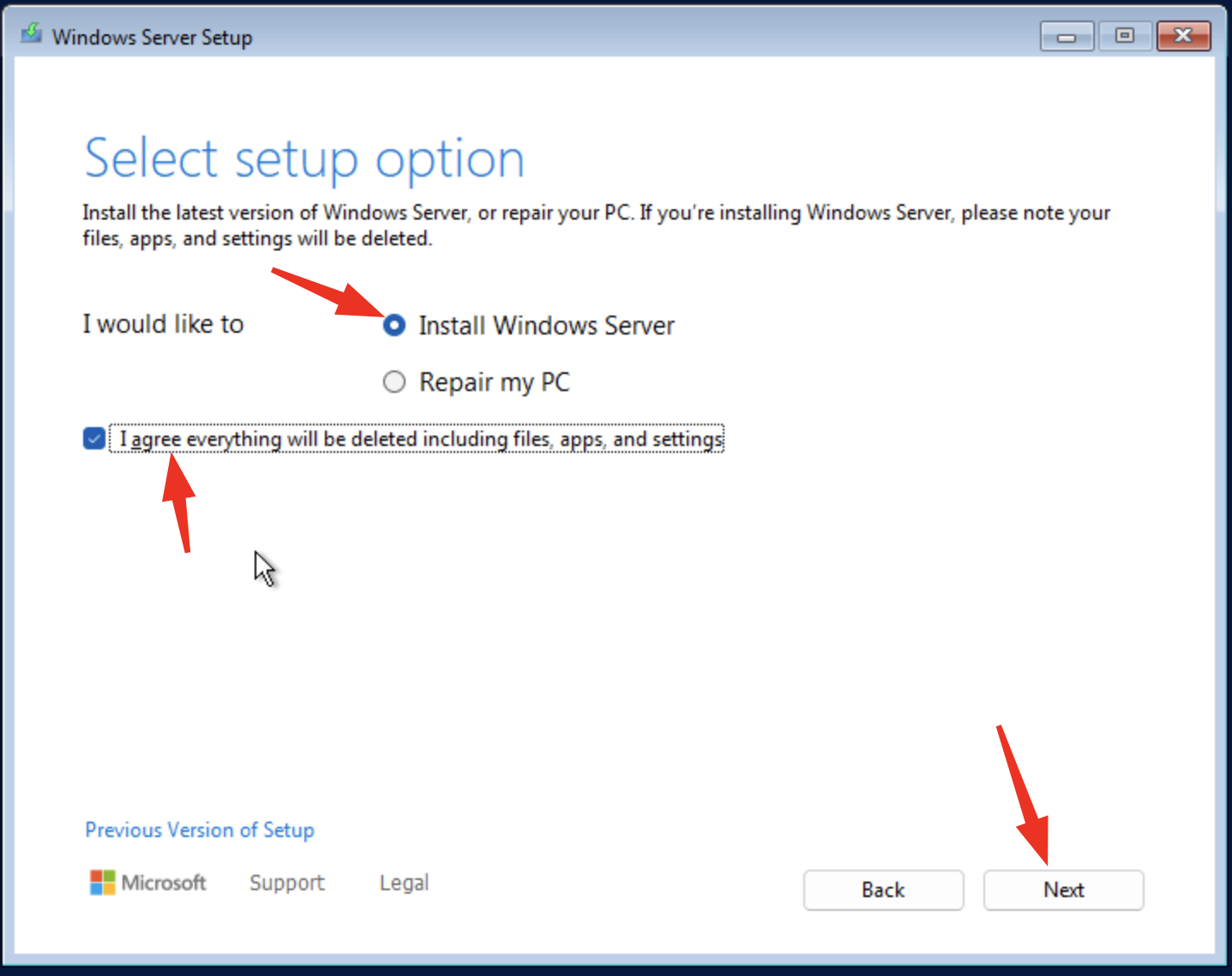 Choisissez Install Windows Server, cochez l’option confirmant l’effacement des données, puis cliquez sur Next.