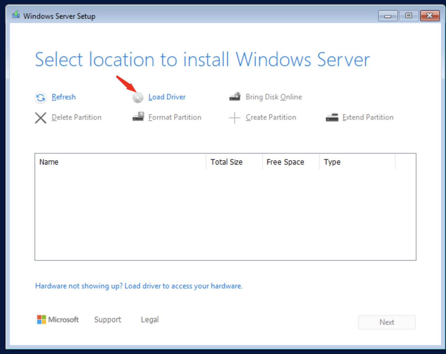 À l’étape suivante, aucun disque n’apparaîtra — Windows Server 2025 n’intègre toujours pas les pilotes nécessaires. C’est normal.