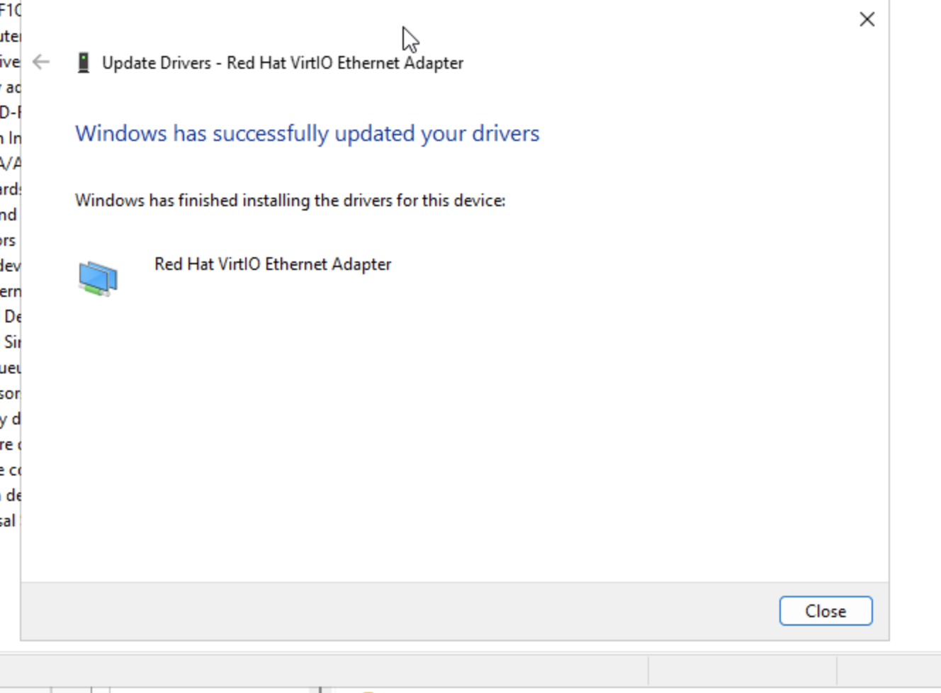 Les pilotes réseau VirtIO sont maintenant installés avec succès et la carte Ethernet est pleinement opérationnelle.