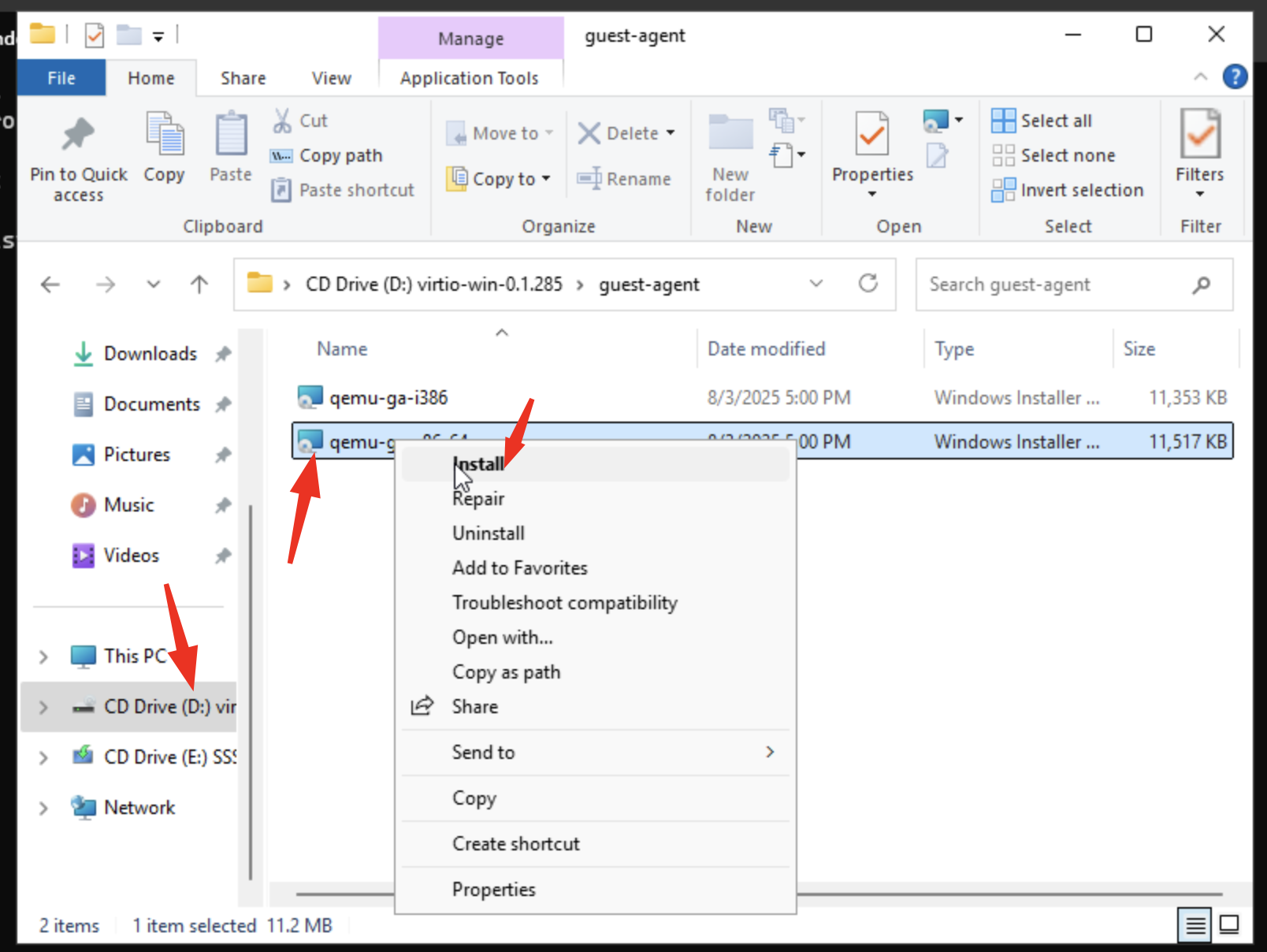 Faites un clic droit sur qemu-ga-x86_64.msi et sélectionnez Install, comme montré sur la capture d’écran.