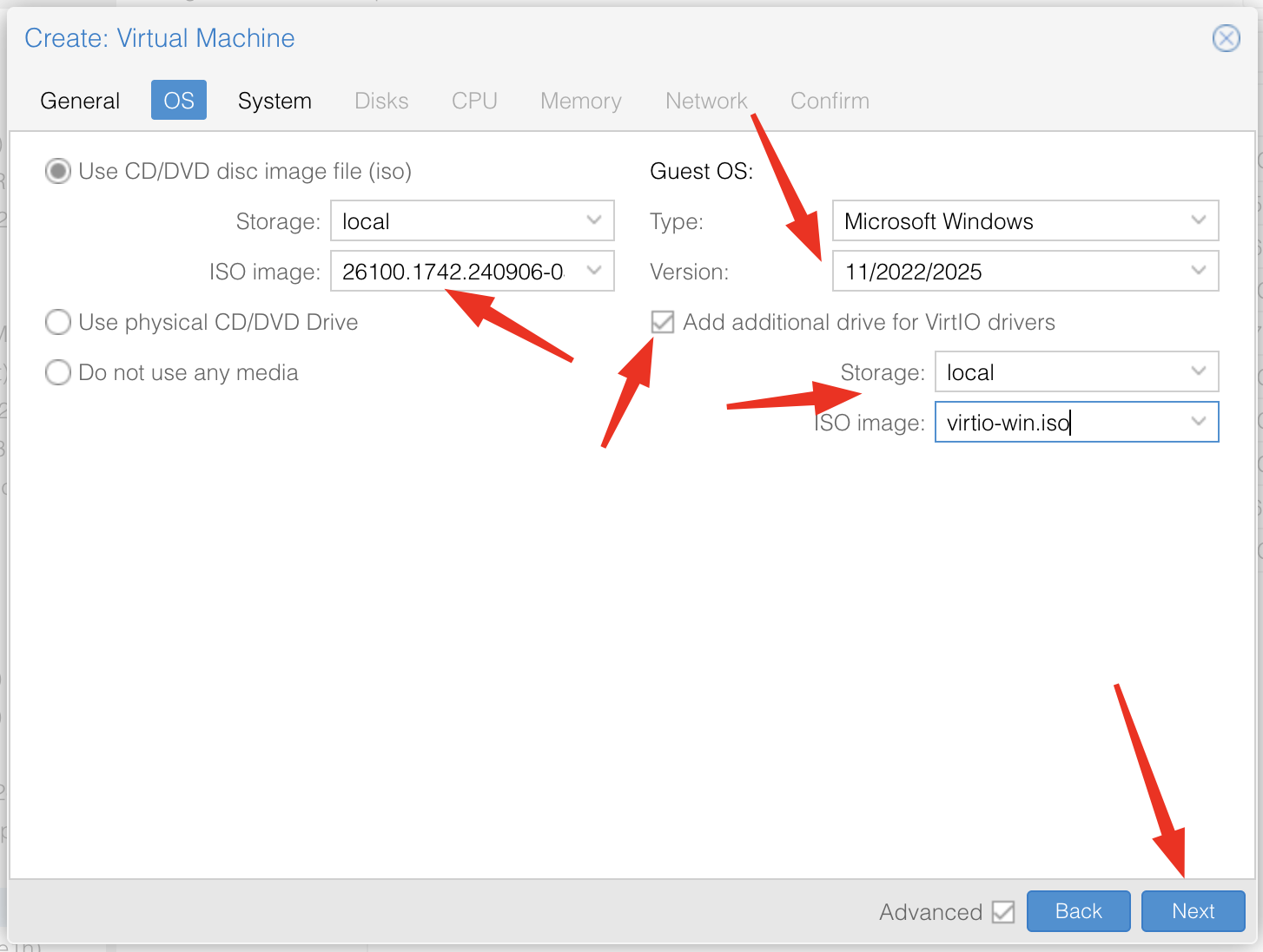 • Cochez Add additional drive for VirtIO drivers et choisissez l’ISO VirtIO.