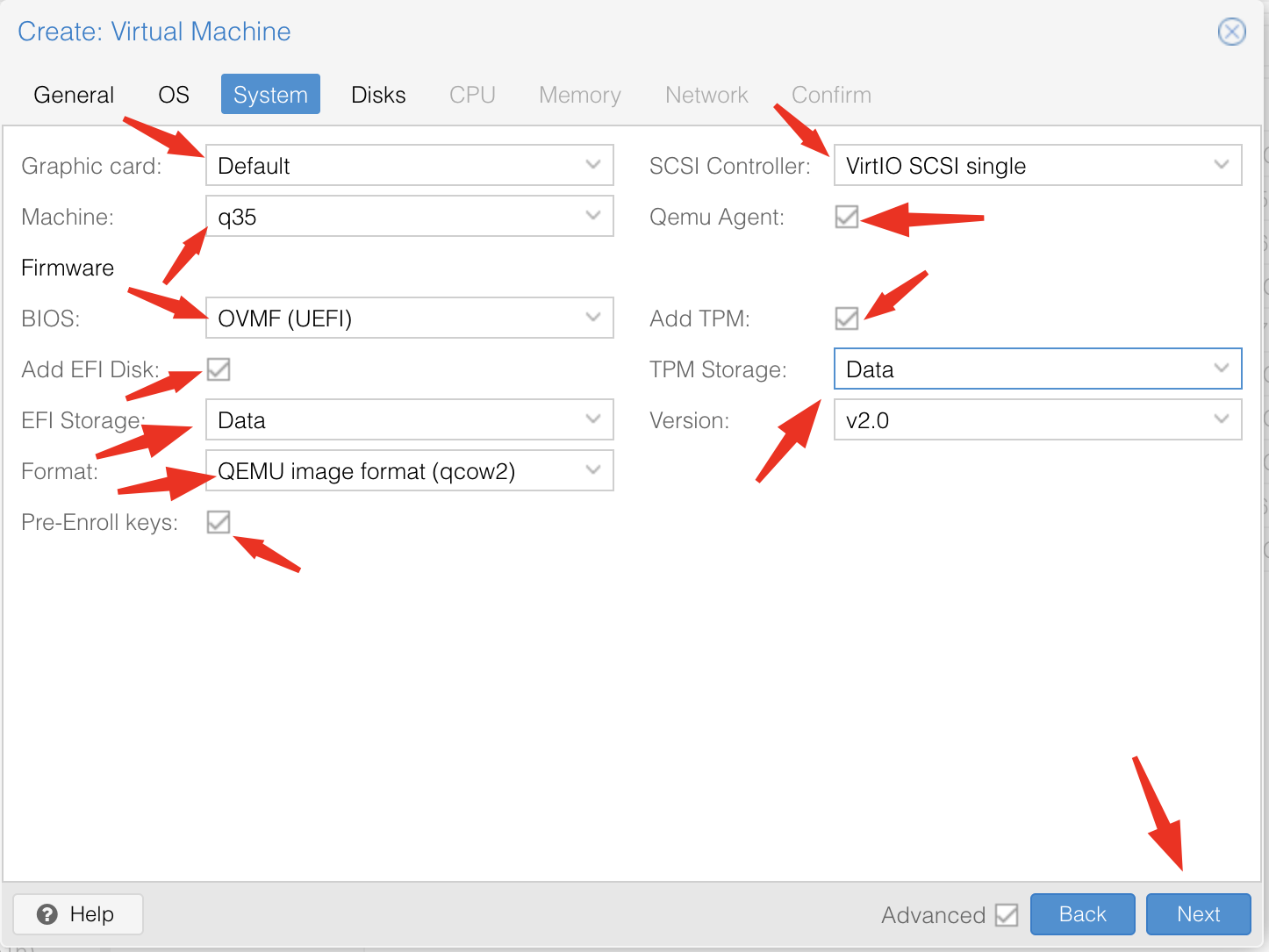 Add EFI Disk + EFI Storage. Cochez Add EFI Disk et sélectionnez un stockage (local, local-lvm, etc., dans mon cas Data).