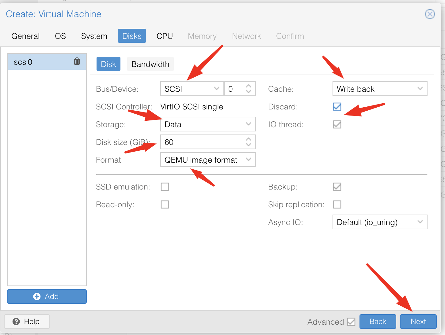 Qemu Agent. Activez Qemu Agent pour permettre l’arrêt propre, la récupération de l’IP et une meilleure intégration Proxmox.