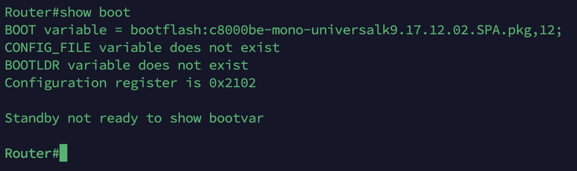 BOOT variable = bootflash:c8000be-mono-universalk9.17.12.02.SPA.pkg,12; Configuration register is 0x2102