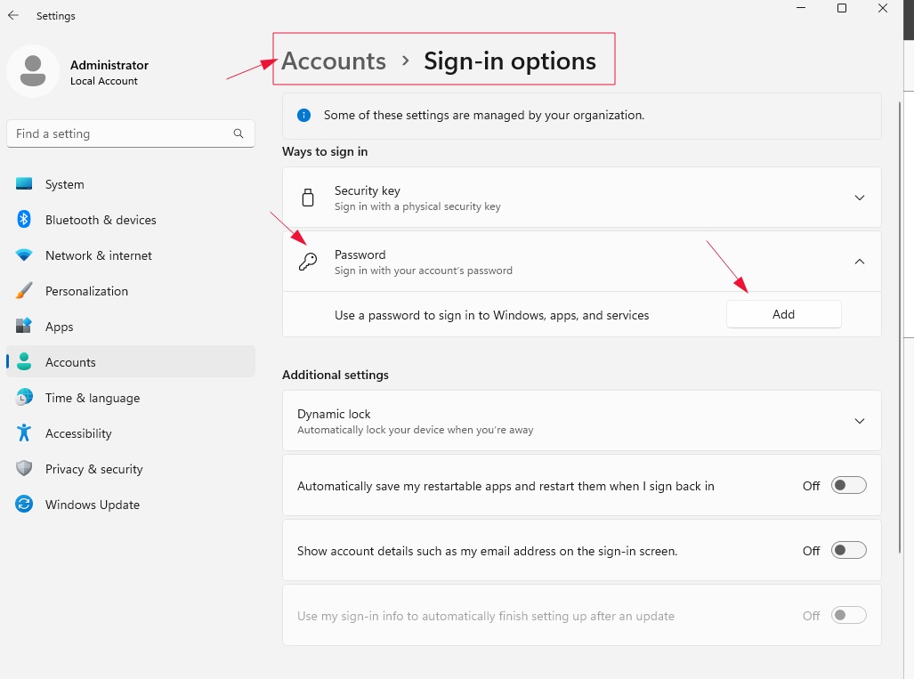 Pour ce faire, allez dans Accounts → Sign-in options → Password, puis cliquez sur Add.