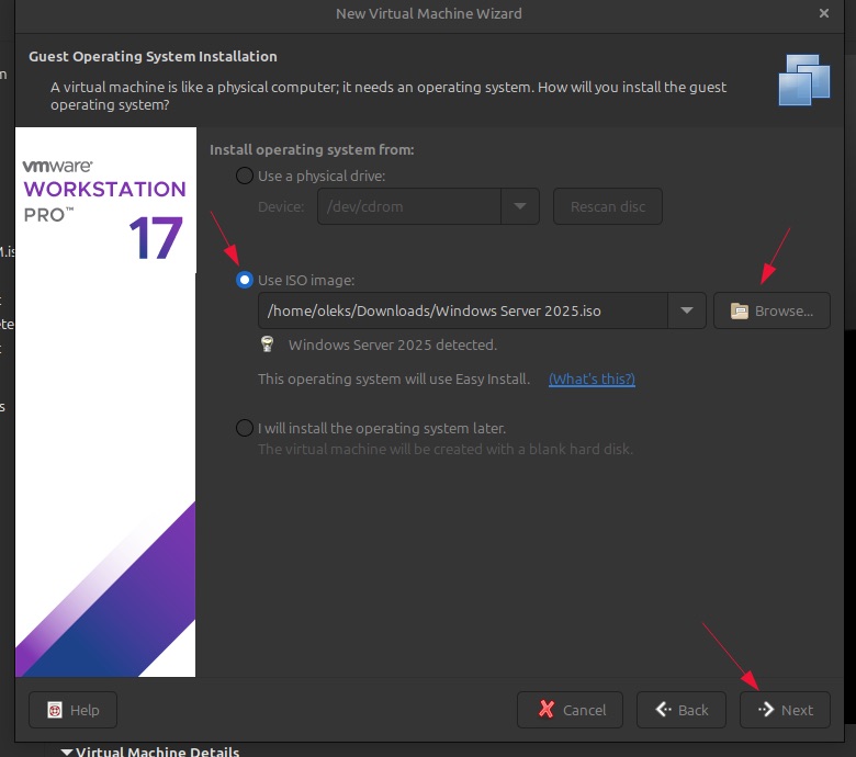 – Cliquez sur Browse pour sélectionner l’image ISO de Windows Server 2025 (à télécharger au préalable depuis le site officiel de Microsoft).