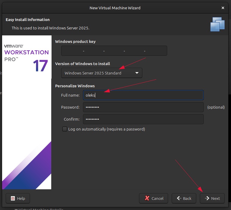 À cette étape, nous fournissons les informations nécessaires pour permettre à VMware Workstation d’effectuer une installation automatique de Windows Server 2025, sans intervention manuelle pendant le processus.