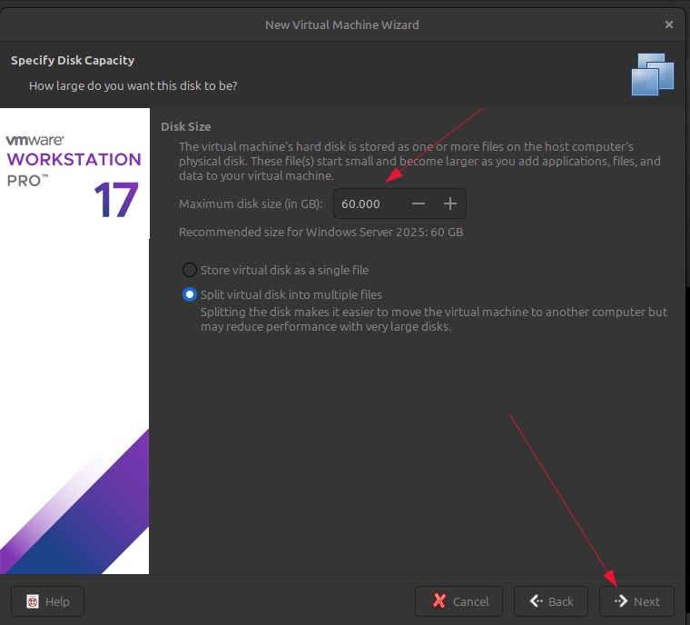 1. Split virtual disk into multiple files. Cette option crée plusieurs petits fichiers au lieu d’un seul gros fichier. Le disque virtuel n’occupe pas immédiatement toute la taille définie sur le disque physique (allocation dynamique plus flexible).