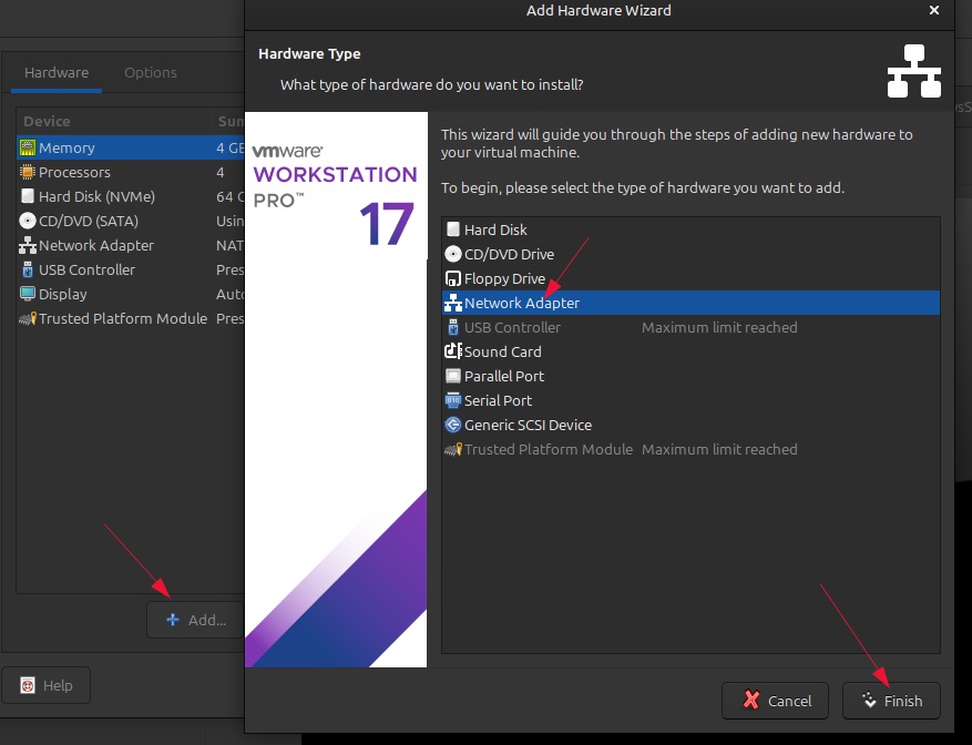 Si vous avez besoin d’une seconde interface réseau (par exemple pour séparer WAN et LAN), cliquez sur Add, puis sélectionnez Network Adapter et validez avec Finish.