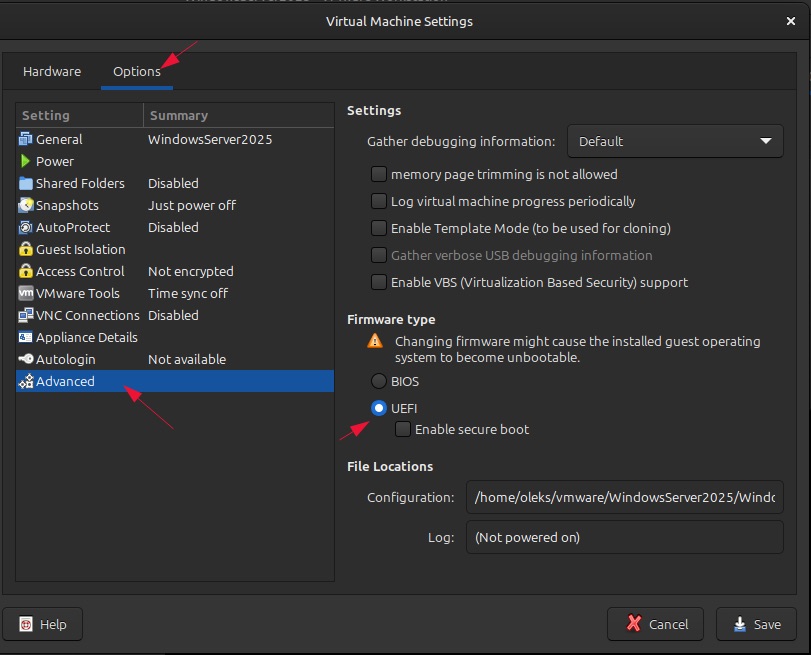 Dans Options → Advanced, assurez-vous que le firmware sélectionné est UEFI (recommandé pour Windows Server 2025)